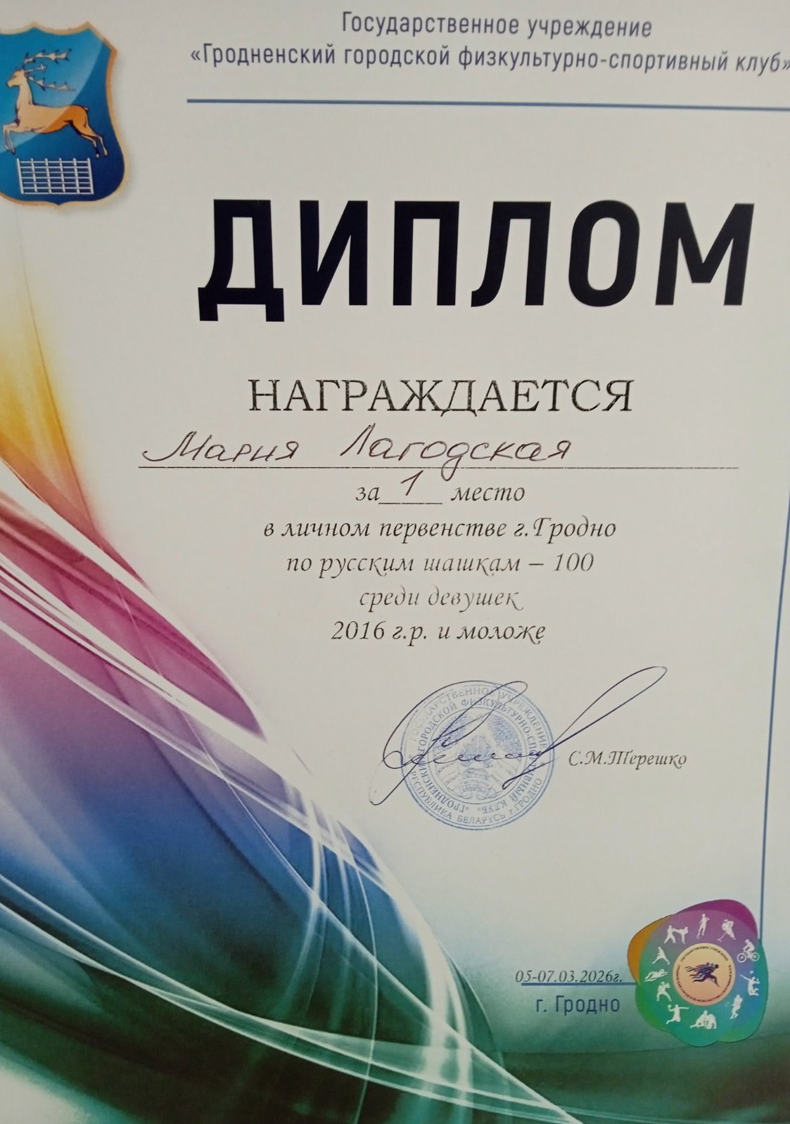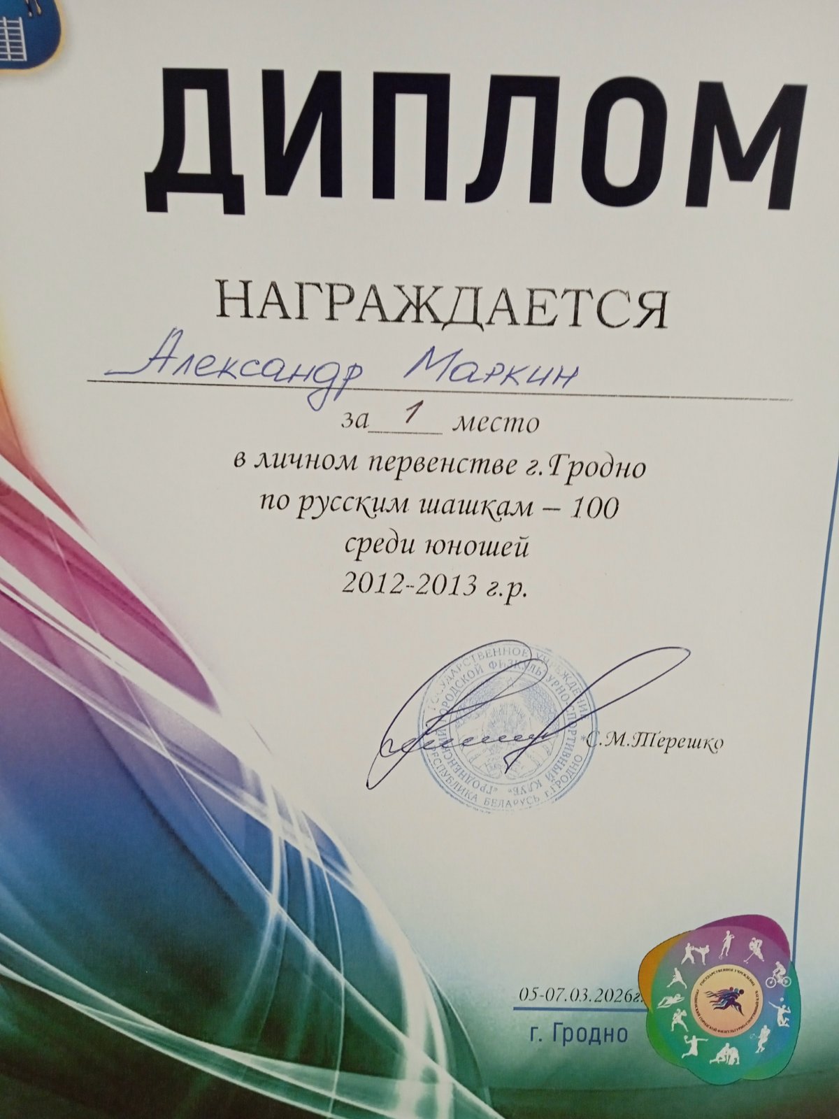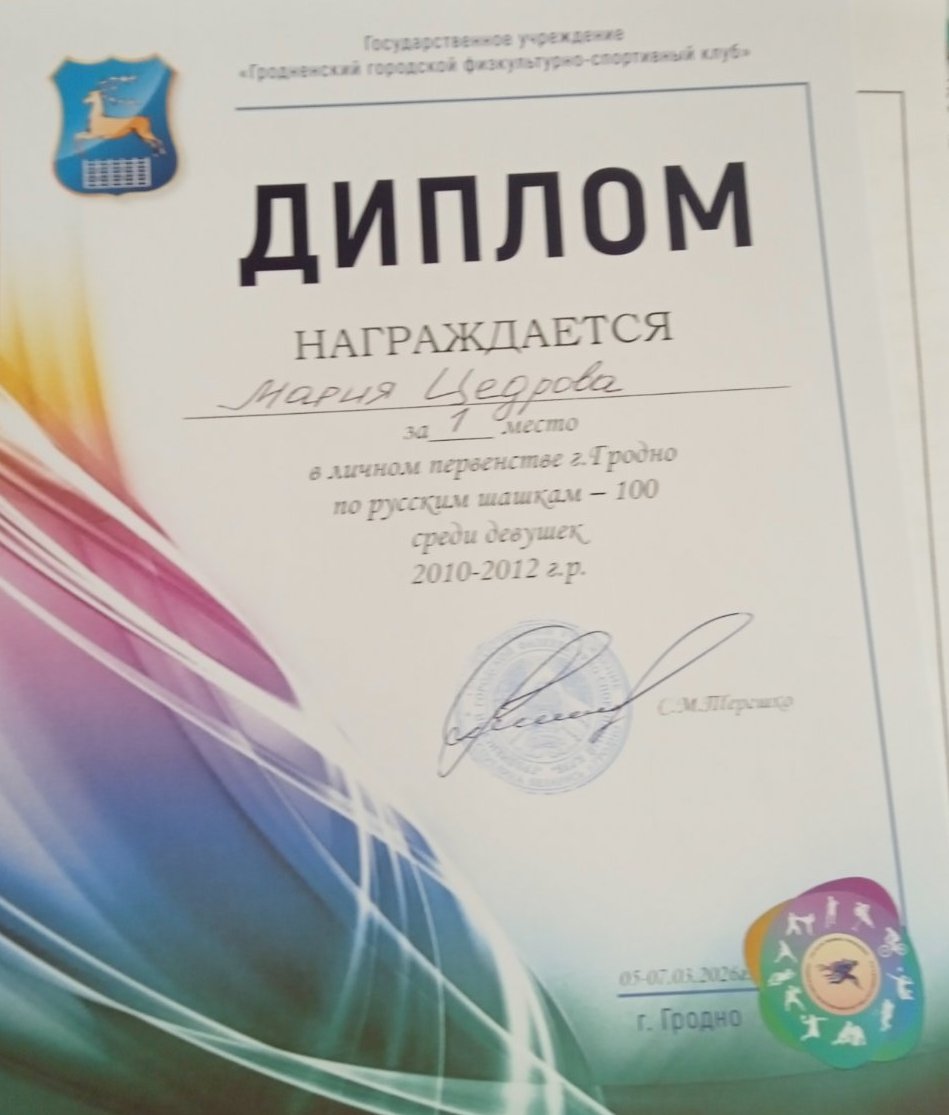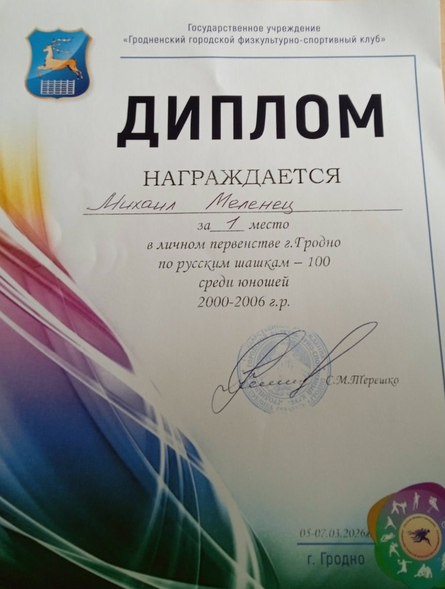 С 5.03.2026 г. по 07.03.2026 г. учащиеся ГУО «ЦТДМ «Прамень» г. Гродно» объединения по интересам «Развивающие шашки» (педагог А.А.Маркин) приняли активное участие в личном первенстве г. Гродно по русским шашкам -100 среди юношей и девушек (2000-2006г.р., 2007-2009г.р, 2010-2012 г.р., 2013-2015г.р.,2016г.р. и моложе).